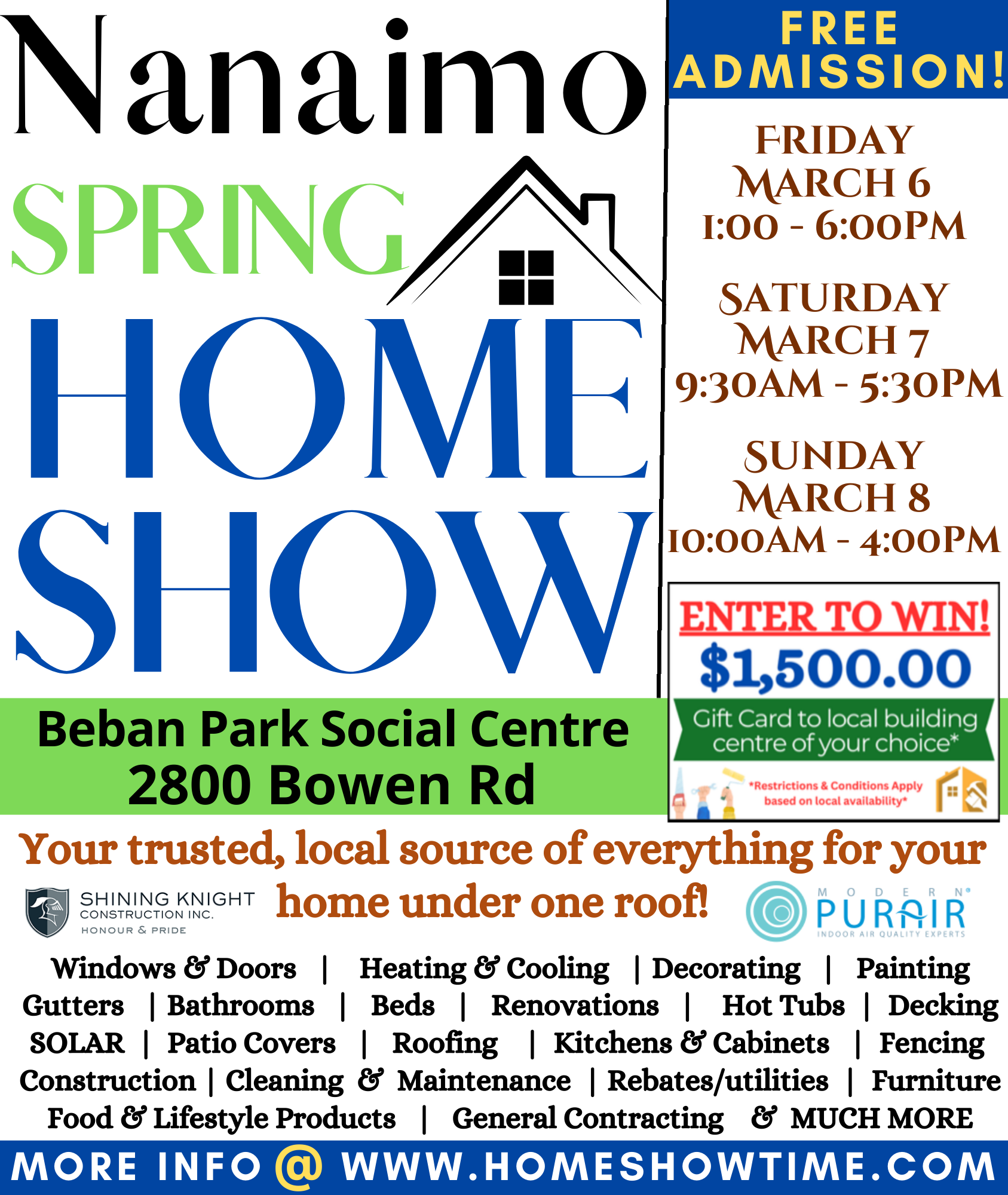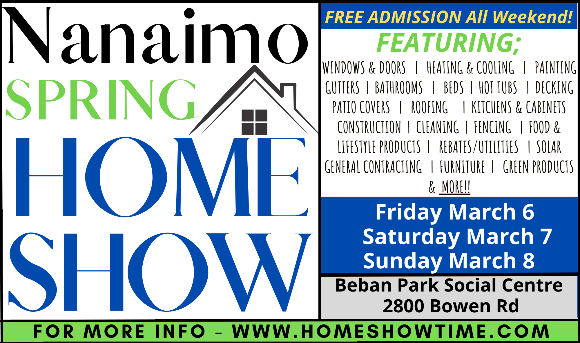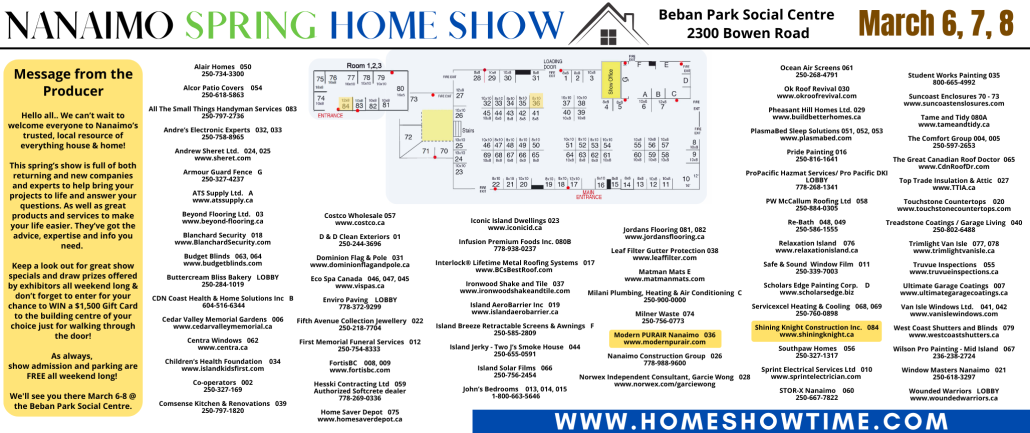 The Nanaimo Spring Home Show is back @ Beban Park, March 2026! This year’s show is expanded and features more space, more exhibits and more variety than ever before! Nanaimo’s ultimate one-stop shop for home improvement and building products, services, deals, Samples and advice in one convenient location!